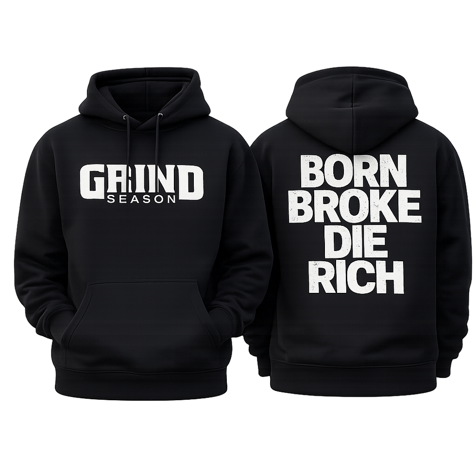 Premium heavyweight hoodie featuring a clean silicone (3D raised) “GRIND SEASON” logo on the front and bold “BORN BROKE DIE RICH” silicone print on the back. Soft fleece interior for warmth and comfort, with a double-lined hood, adjustable drawstrings, and a front kangaroo pocket. Built for everyday wear—durable, smooth, and made to stand out.